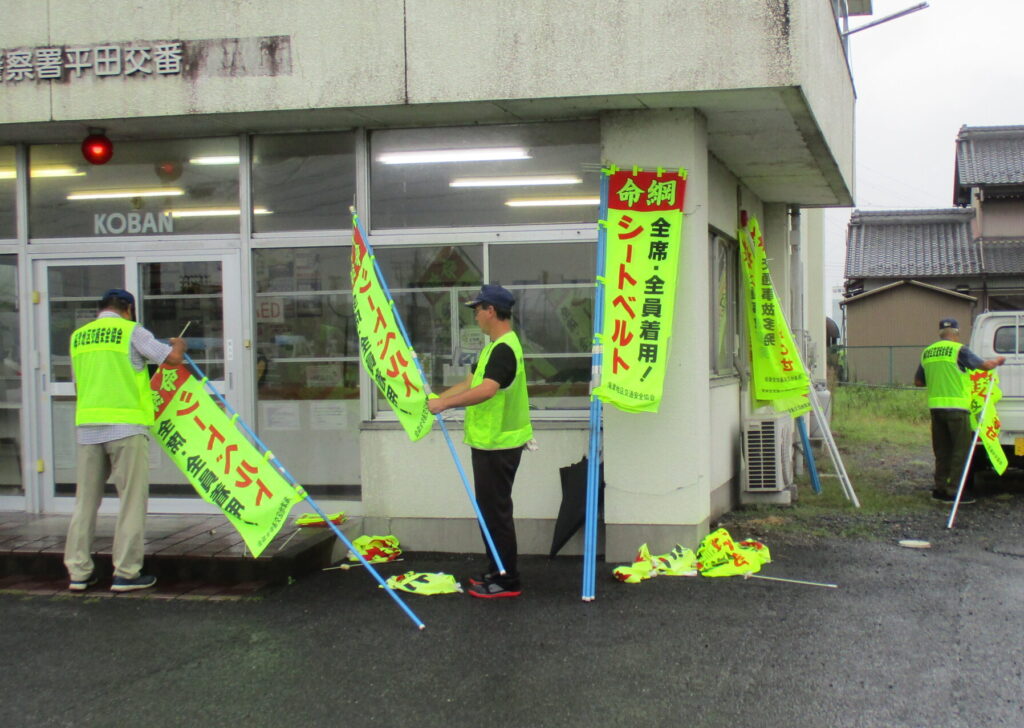 海津地区交通安全協会では、秋の全国交通安全運動を1週間後に控えた令和7年9月13日、交通安全広報用のぼり旗を点検し、地区内の主要交差点等に設置しました。