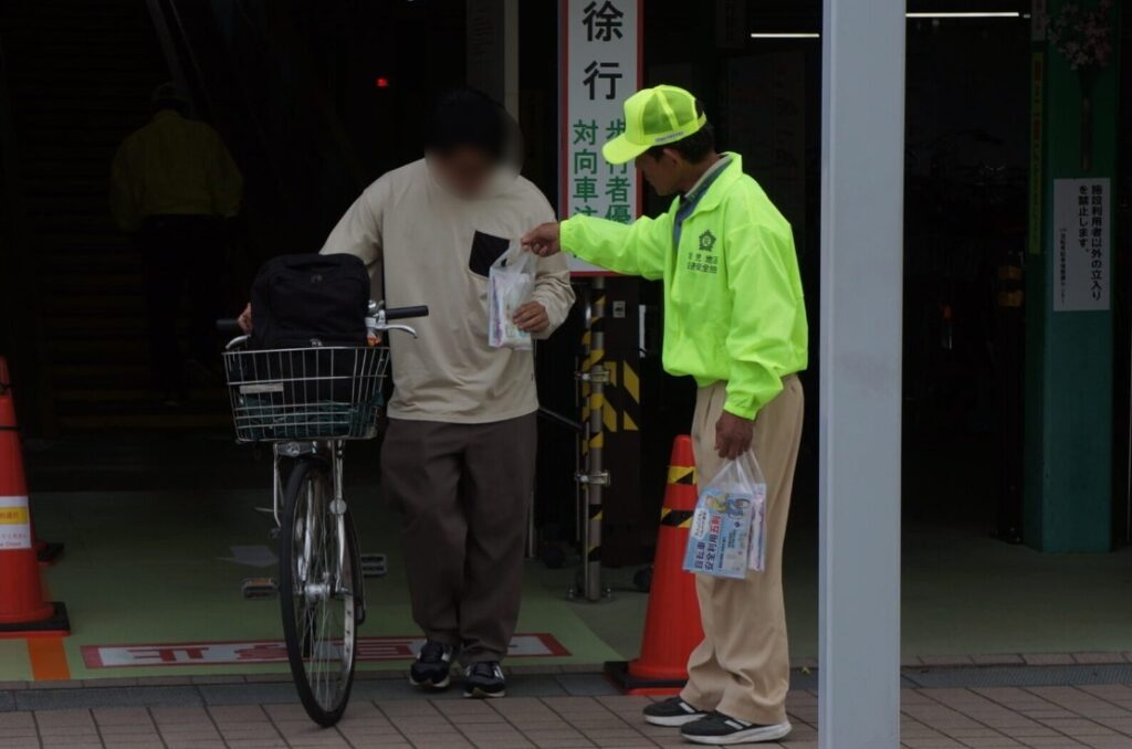 東濃地区交通安全協会では、令和8年4月6日から4月15日までの春の全国交通運動期間中の令和8年4月13日、土岐市泉町久尻地内のJR中央線土岐市駅前駐輪場において、自転車利用のみなさんにチラシや交通安全グッズをお配りする等して、自転車の反則通告制度適用や安全利用を呼びかけました。