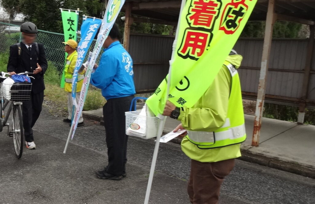 養老地区交通安全協会では、令和8年4月6日から4月15日までの春の全国交通安全運動の活動として、令和8年4月15日、養老郡養老町祖父江向野地内の岐阜県立大垣養老高校において、自転車通学の生徒にチラシや反射材をお配りする等して、自転車の安全利用を呼びかけました。