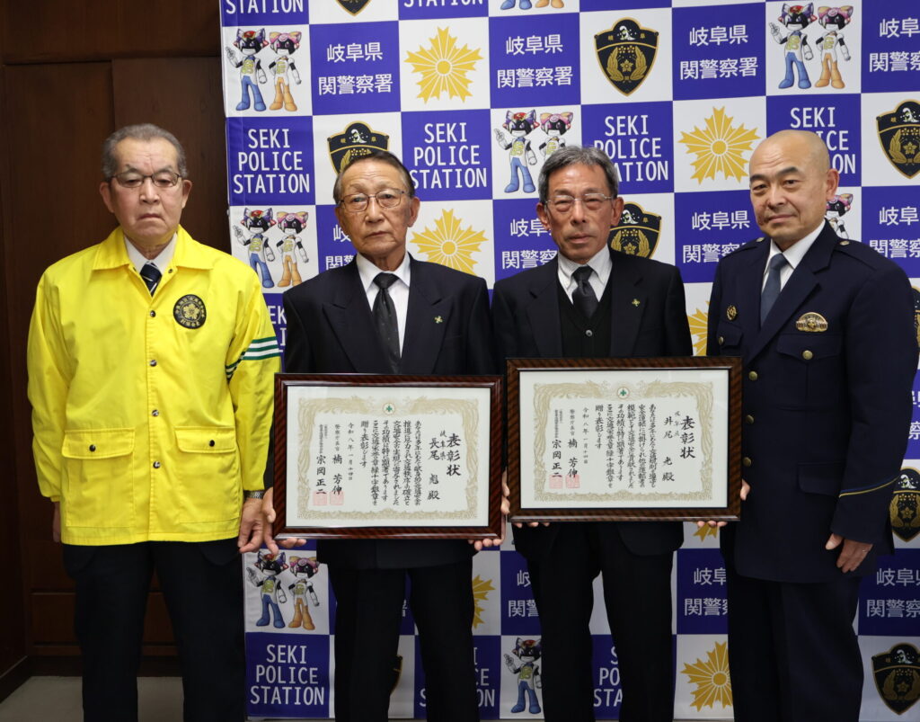 中濃地区交通安全協会から推薦を受け、交通安全功労者として交通栄誉章緑十字銀章を受章された長屋彪さんと優良運転者として交通栄誉章緑十字銀章を受章された井尻光さんが、令和8年1月29日、関警察署を訪問し、関警察署長に受章を報告しました。