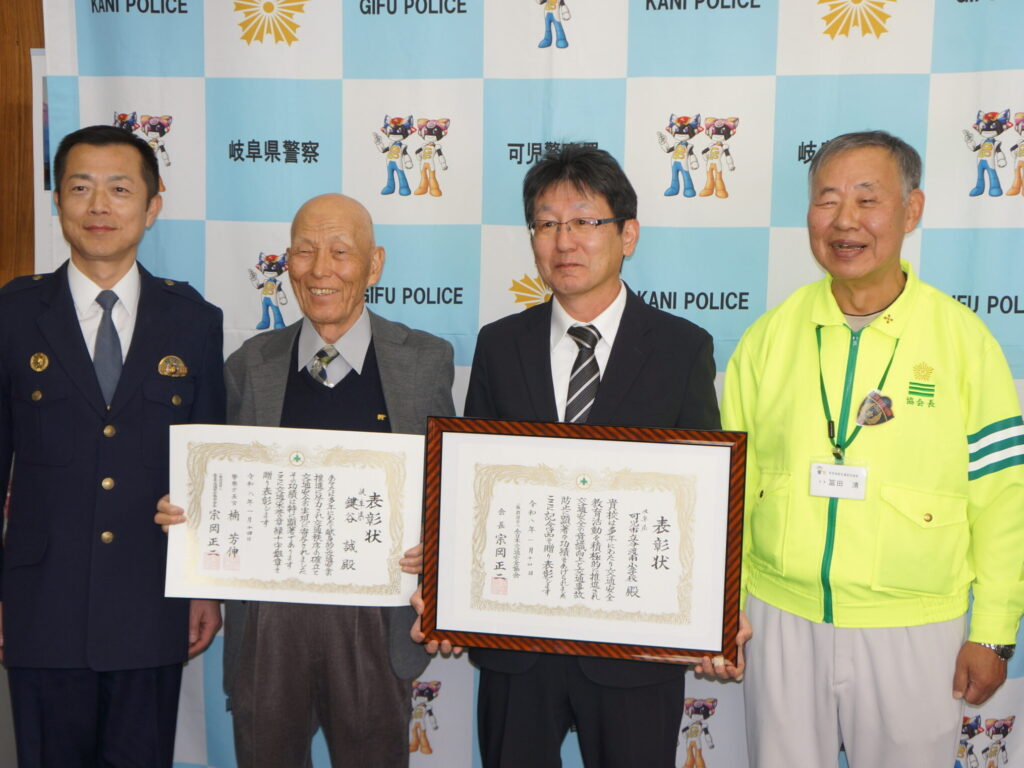 可児地区交通安全協会から推薦を受け、交通安全功労者として交通栄誉章緑十字銀章を受章された鍵谷誠さんと交通安全優良学校として表彰を受けた可児市立今渡南小学校の校長先生が、令和8年1月22日、可児警察署を訪問し、可児警察署長と可児地区交通安全協会協会長に受章を報告しました。