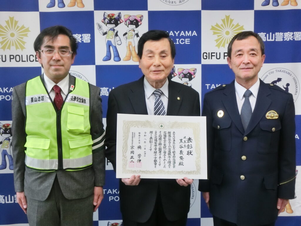 高山地区交通安全協会から推薦を受け、交通安全功労者として交通栄誉章緑十字銀章を受章された黒谷義隆誠さんが、令和8年1月23日、高山警察署を訪問し、洞口高山警察署長と桑谷高山地区交通安全協会協会長に受章を報告しました。